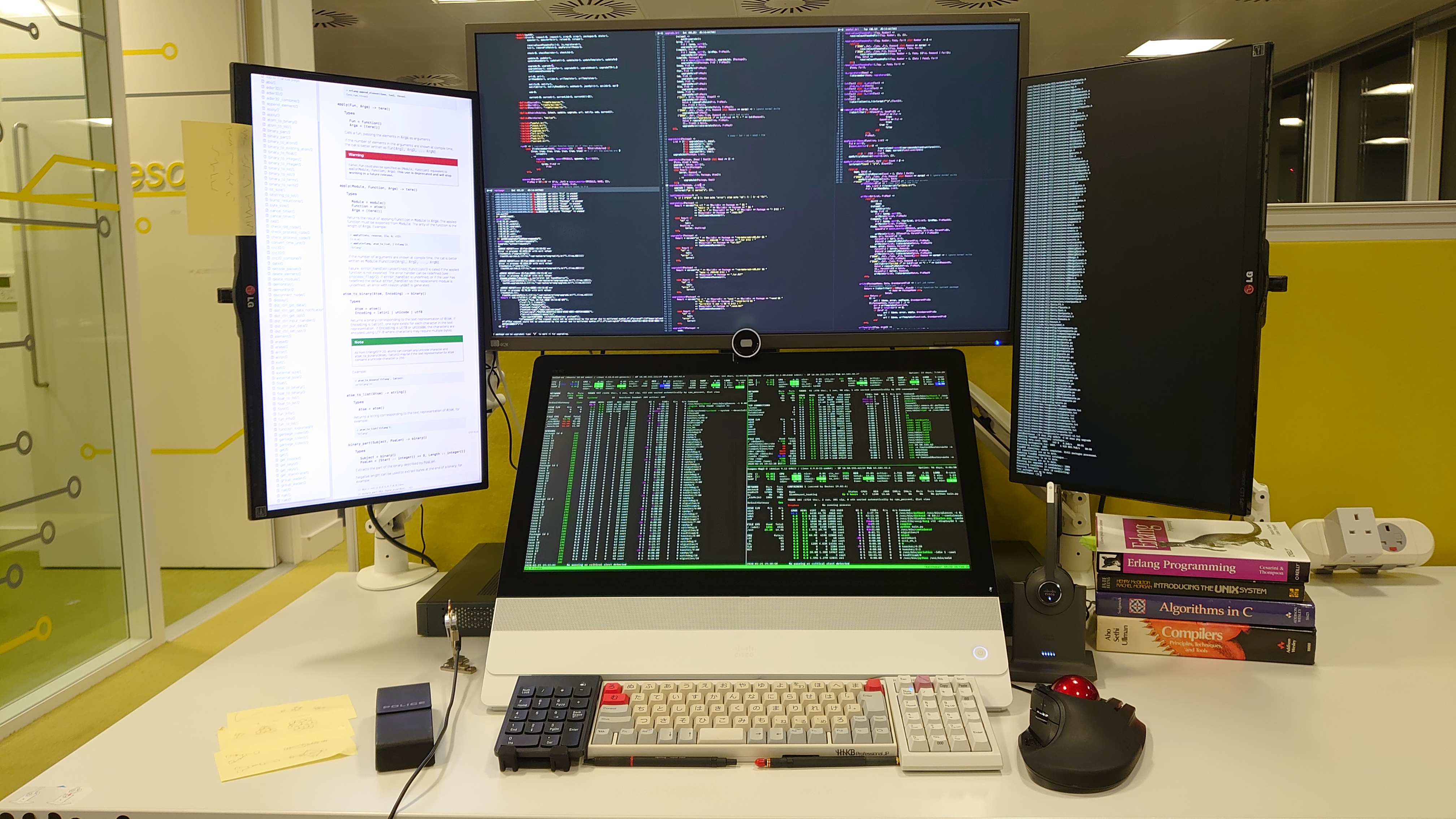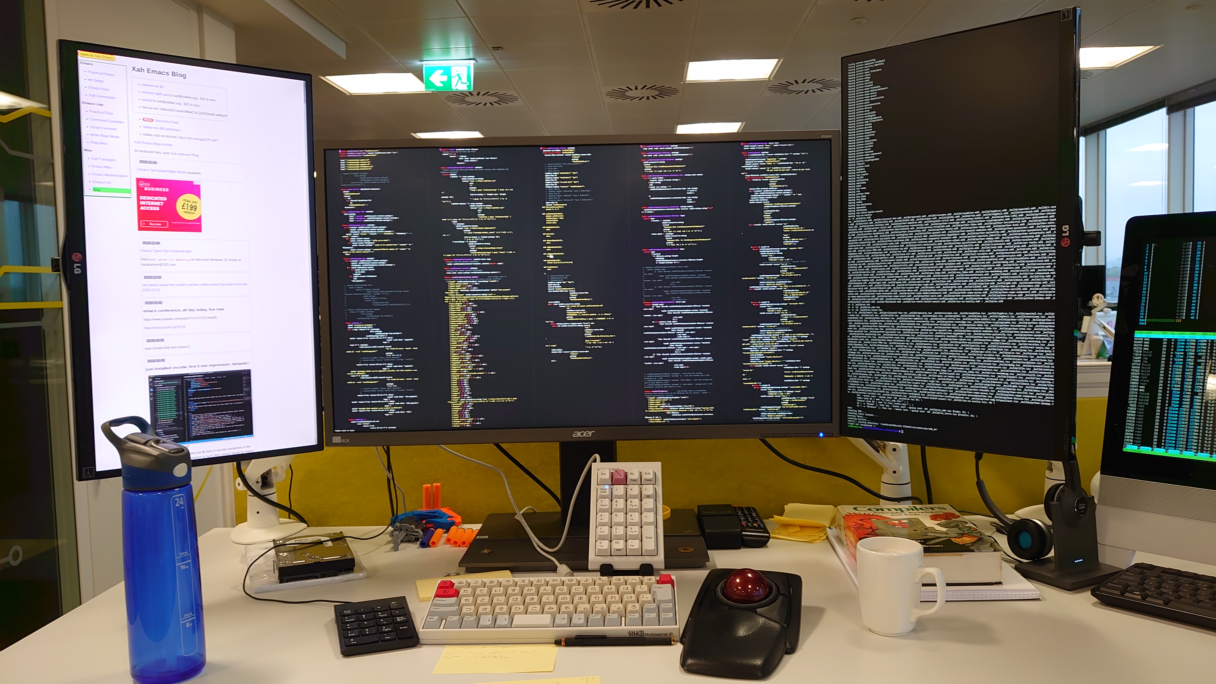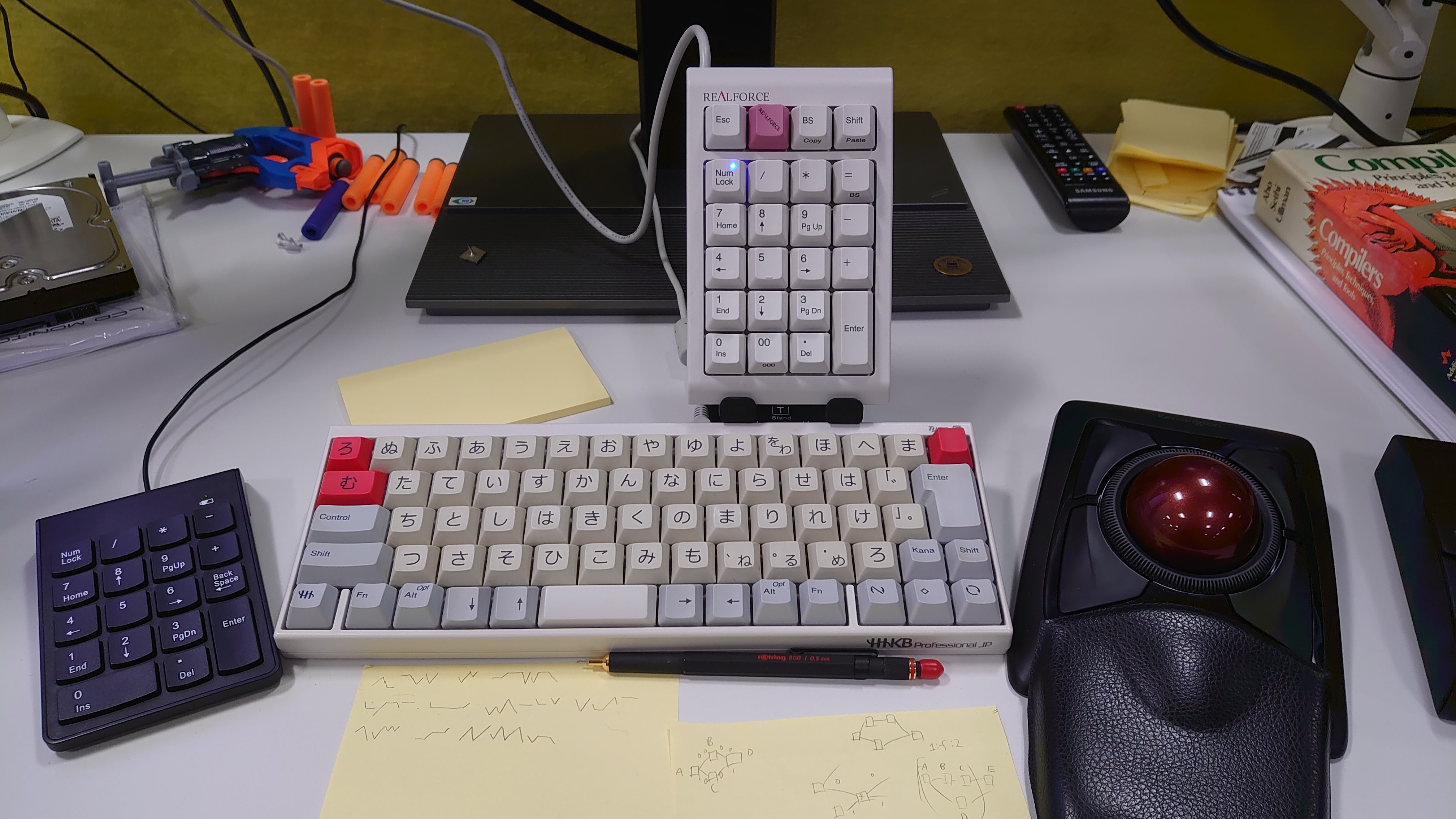 I've programmed the hhkb with my own keyboard layout that I've been evolving over the past few years. And on the filco I have it send f13-f24 keys.. I have 3 screens, and 3 desktops on each consisting of emacs, Firefox and terminal. So I have a 3x3 section dedicated to switching monitor focus and changing the desktop. So pressing '1' will switch to Emacs running on my left monitor. I then have keys for full screen, kill etc...