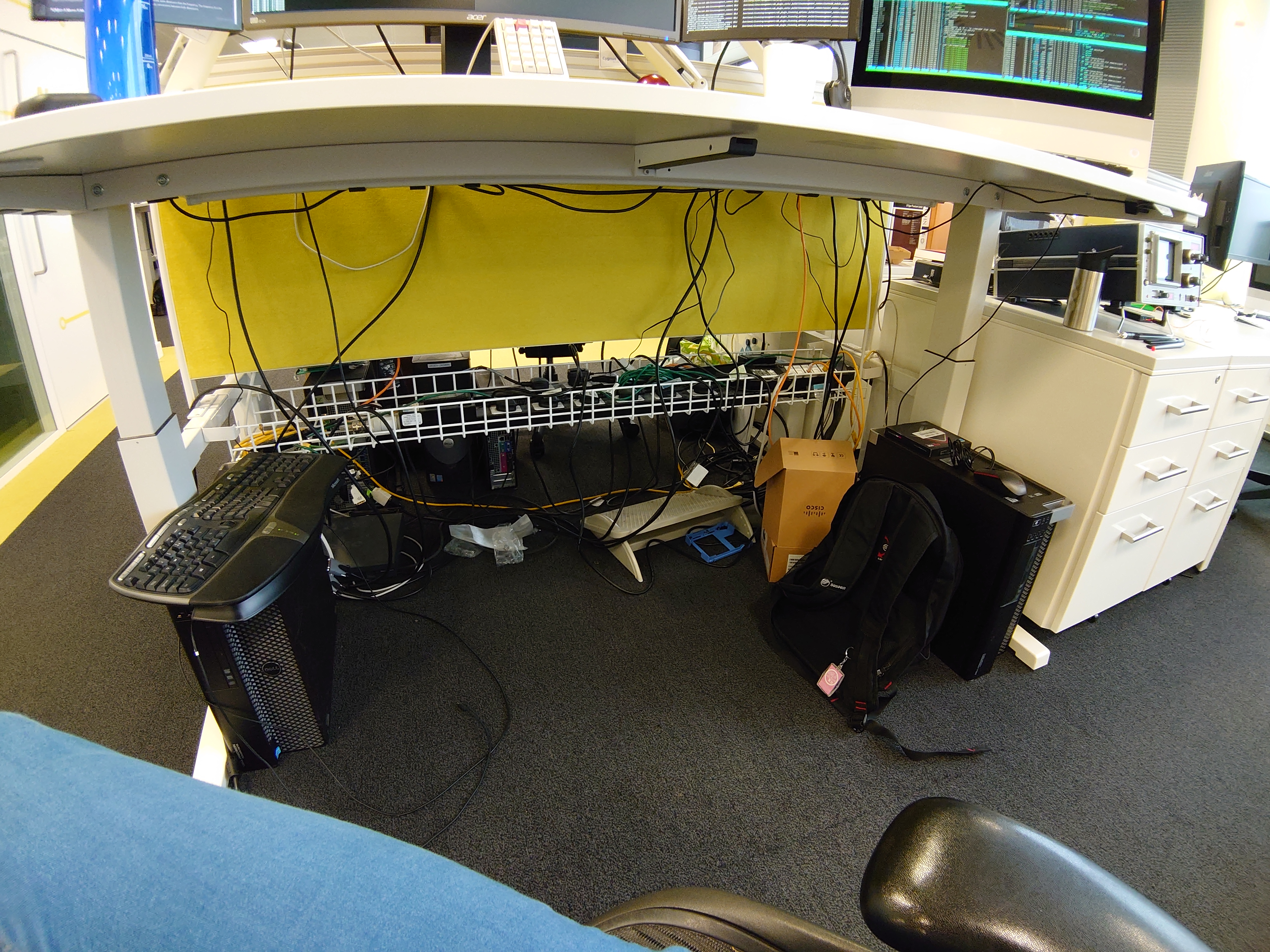 So on the workstation (left) I run Firefox and terminal and stuff - this is the machine that has all my monitors and keyboards plugged into. On the server (right) I run my Emacs server. I then forward X over ssh to run Emacs on my machine with all the screens. This way Firefox doesn't take up cpu and ram and I can restart it is something goes funky without losing my Emacs sessions. And finally I have the UCS supercomputer that I use tramp with to remotely edit files on.
